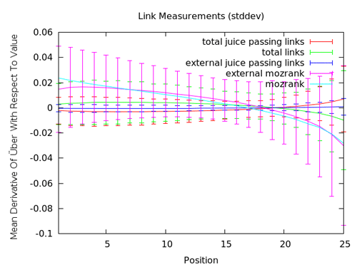 Our link measurements also get more sophisticated (and tell a more nuanced story) when we use the ranking models. You can see above that improving mozRank in the top results appears important, while raw # of links may be less valuable. However, when we look further back in the results, you see the negative dip, suggesting that some pages may be over-using mozRank and external links (quite possibly from less reputable/spammy sources). This graph doesn't have a ton of actionable data (as controlling the amount of mozRank or even the number of external links you get is probably not wise), but it does fit fairly nicely to a lot of the things we know about SEO - good links help, bad links might hurt.
