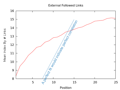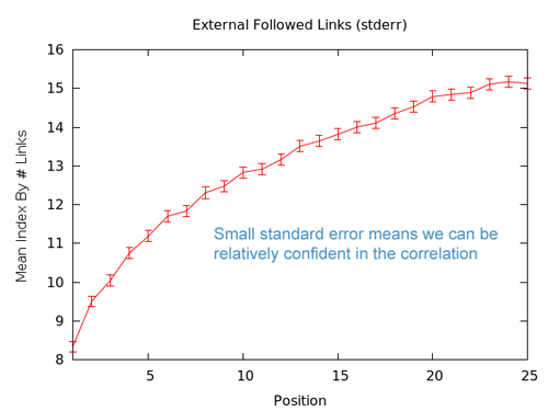 We're looking good. The correlation is quite strong, suggesting that yes, the number of external, followed links is important and the standard error is low, so we can feel confident that the correlation is real. Clearly, though, comparing with the perfect fit line, links are not the whole picture. Having the most links out of your peers in the results is likely a very good goal, but it can't be the only goal.