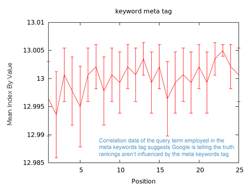 Google recently announced that they ignore the meta keywords tag. This data, showing a line that's very spiky and error bars showing stderr (standard error) all within the horizontal at "13" certainly supports that assertion. Employing the query term/phrase in the meta keywords is one of the least correlated signals we've examined.