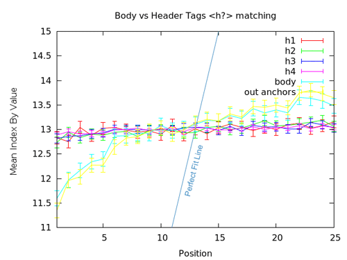 We've examined H1/H2/Hx tags in the past and come to the conclusion that they have little impact on rankings. This graph certainly suggests that's still the case. Employing the query in other on-page areas such as the body (anything between the <body> tags) and out anchors (employing the keyword in the <a> tag whether internal or external) have significantly greater correlation with rankings, while H1-H4 tag keyword use appears almost horizontal on the graph (suggesting no benefit is derived from its use). It's not as bad as the random effect we observed with meta keywords (the lines all start a tiny bit below 13 and end a tiny bit above), but the positive correlation is low and the horizontal is mostly inside the error bars.