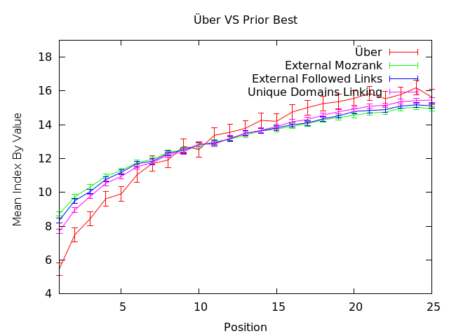 - Mean Index By Value: These are used for the y-axises of many charts. Instead of averaging the raw values, we average it's relative index in the SERP if ordered by this value. So if there are 3 SERPs, and the page in the first position has the 4th most links, the 2nd has the 1st most links, and the 3rd has the 10th most links, the mean index by # of links for the first position would be (4+1+10)/3 = 5.