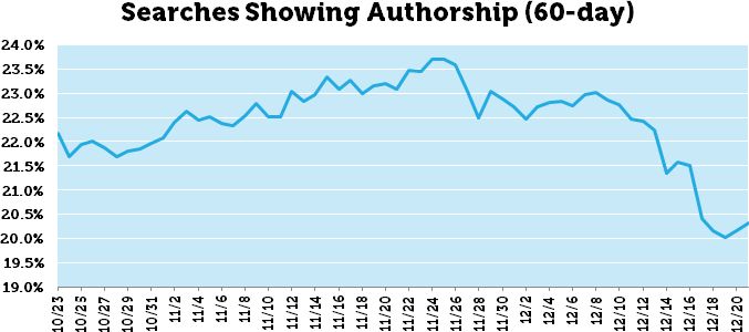 Interestingly, authorship actually climbed a bit after Matt's announcement, before eventually dropping. There was a 9.6% relative drop from Oct. 23 to Dec. 19. These numbers all line up pretty well with Matt's predicted 10-15% range, and he confirmed around Dec. 19 that the authorship change had rolled out. Since Dec. 19, authorship presence in our data set has ranged from 19.8% to 20.3%. There has been no substantial recovery.