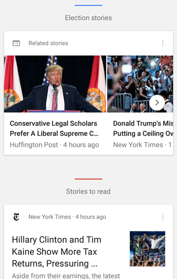 Here, I've got another news carousel (note its similarity to mobile search news carousels), and then an individual news story with its own card. Google Now shows that you can create a result using virtually no traditional organic results and mix multiple Knowledge Graphs, news, and other entities in a single, fluid experience.