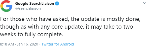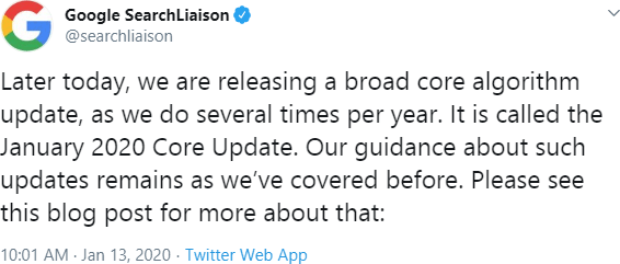 That same day, Google announced the release of a core update dubbed the January 2020 Core Update (in line with their recent naming conventions) ...