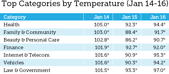 MozCast is split into 20 verticals, matching Google AdWords categories. It can be tough to interpret single-day movement across categories, since they naturally vary, but here's the data for the range of the update (January 14–16) for the seven categories that topped 100°F on January 14 ...