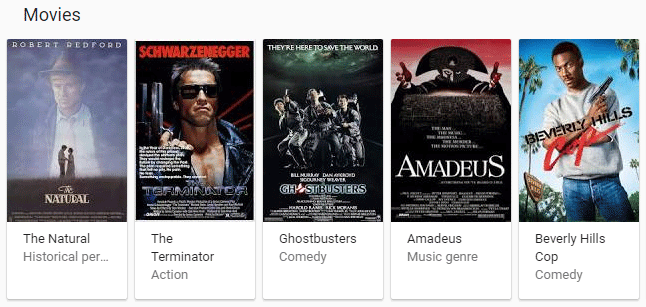 This type of list carousel covers a wide range of topics, from "cat breeds" to "types of cheese." Here's an interesting one for "best movies of 1984." The image is truncated, but the full result includes drop-downs to select movie genres and other years...