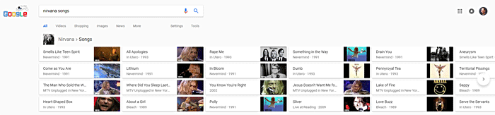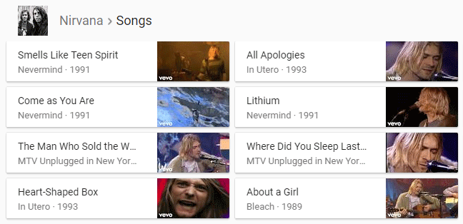 Once again, each result links to a new search with a Knowledge Panel dedicated to that movie. Another style of carousel is the multi-row horizontal scroller, like this one for "songs by Nirvana"...
