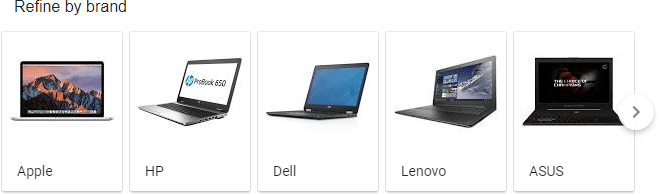 A search for "laptops" (a very competitive, commercial term, unlike the informational searches above) has a number of interesting features. At the bottom of the search is this "Refine by brand" carousel...
