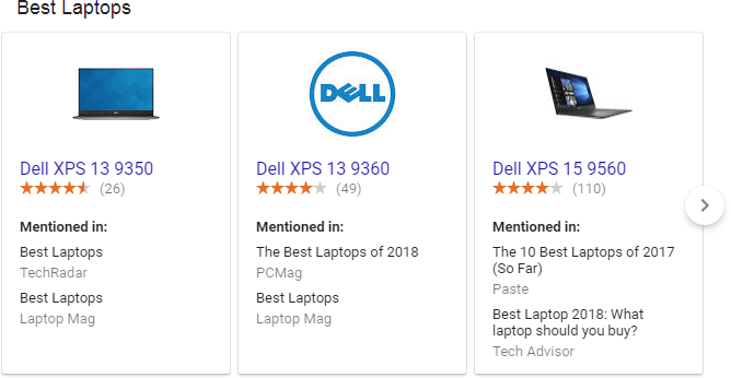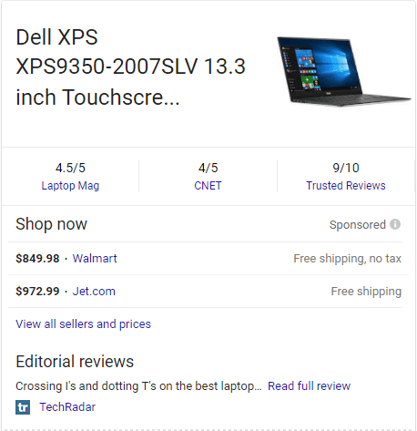 The smaller "Mentioned in:" links go to articles from the listed publishers. The main, product links go to a Google search result with a product panel. Here's what I see when I click on "Dell XPS 13 9350" (image is truncated)...