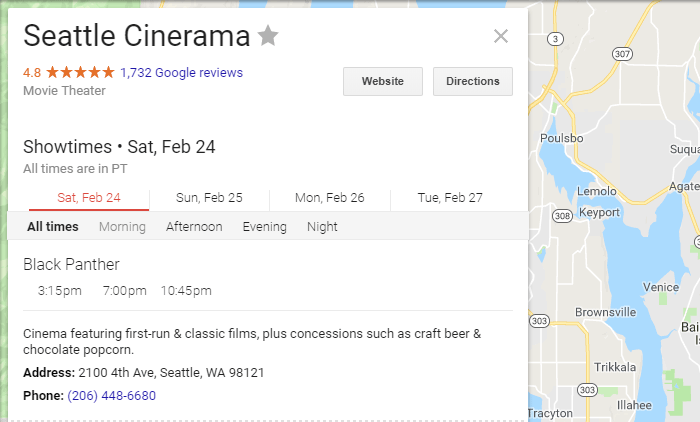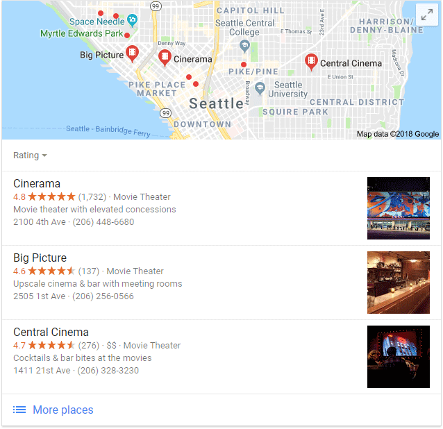 A similar evolution has been happening in local results. Take the local 3-pack — here's one on a search for "Seattle movie theaters"...