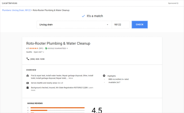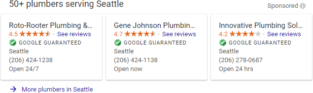 In addition, Google has launched specialized ads for local service providers, such as plumbers and electricians. These appear carousel-style on desktop, such as this one for "plumbers in Seattle"...