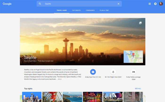 Click on "Seattle travel guide" and you'll be taken to a customized travel portal for the city of Seattle. The screen below is a desktop result — note the increasing similarity to rich mobile experiences.