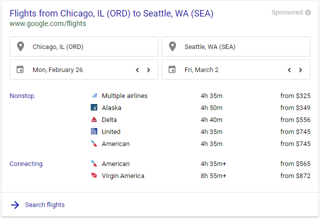 Like hotels, Google has dabbled in flight data and search for years. If I search for "flights to Seattle," Google will automatically note my current location and offer me a search interface and a few choices...