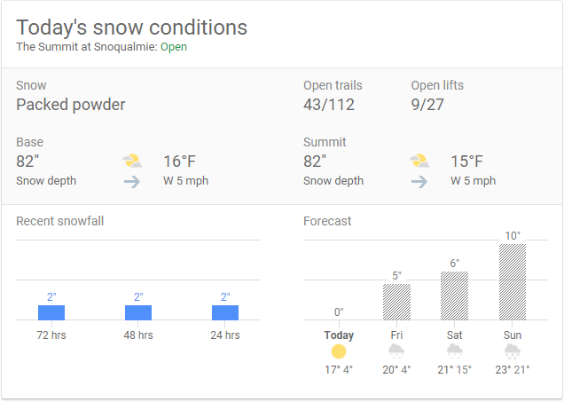 These partnerships have branched out over time into even more specialized results. Consider, for example, "Snoqualmie ski conditions"...