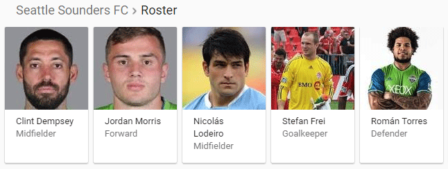 Speaking of carousels, Google has been experimenting with a variety of horizontal result formats, and many of them are built around driving traffic back to Google searches and properties. One of the older styles of carousels is the list format, which runs across the top of desktop searches (above other results). Here's one for "Seattle Sounders roster"...