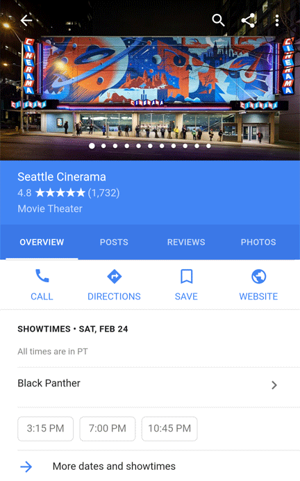 Movie searches yield a rich array of features, from Live Results for local showtimes to rich Knowledge Panels. Last year, Google completely redesigned their mobile experience for movie results, creating a deep in-search experience. Here's a mobile panel for "Black Panther"...