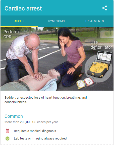 In 2015, Google launched Medical Knowledge Panels. These gradually evolved into fully customized content experiences created with partners in the medical field. Here's one for "cardiac arrest" (truncated)...