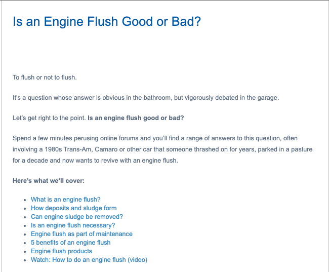 An example of a post that benefitted from some extra love was our engine flush blog post. It became our hallmark for how we could optimize good writing on a relevant topic into a high-ranking and ultra-SERP-friendly post.