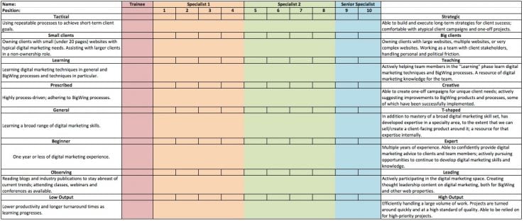 At the beginner level, people are learning digital marketing in general and learning about our specific internal processes. As they gain experience, they become a resource for team members still in the "learning" phase, and at the senior level they should be a go-to for tough questions and expert opinions.