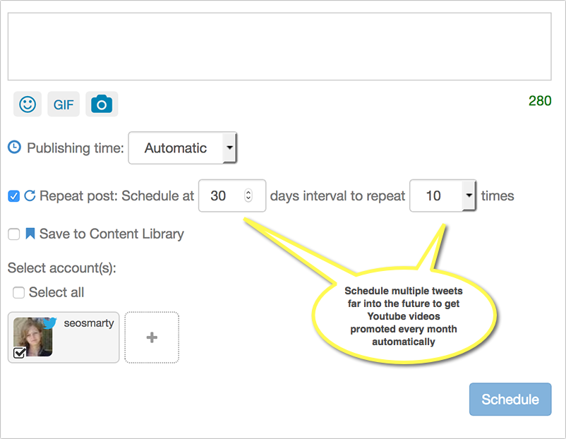 - Use recurring tweets to scale video promotion. There are a few tools you can try, such as DrumUp. Schedule the same update to go live several times on your chosen social media channels, generating more YouTube views from each repeated share. This is especially helpful for Twitter, because the lifespan of a tweet is just several minutes (between two and ten minutes, depending on how active and engaged your Twitter audience is). With recurring tweets, you'll make sure that more of your followers see your update.
