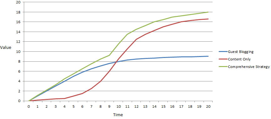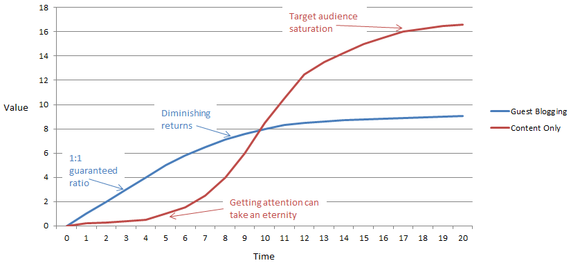 Guest blogging’s strength is that you can launch immediately, avoiding that lonely feeling of blog posts that no one comments on. However, the guest-blog-only strategy has two fatal weaknesses: 1) there is an obviously fixed ratio of one linking domain per article placed, and 2) you reach rapidly diminishing returns. Furthermore, ideal blogs are a finite resource, and you can either lower your standards or post again on a good blog. Neither option is necessarily bad, but both have diminishing returns.