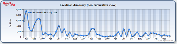 Now a profile like this is a bit more expected. They seem to have had a strong push at one time, but the link acquisition has faded over time. They have periods of spiky growth and have had minimal link growth in the last part of 2010.. This is a good sign if you’re looking to outrank this site.
