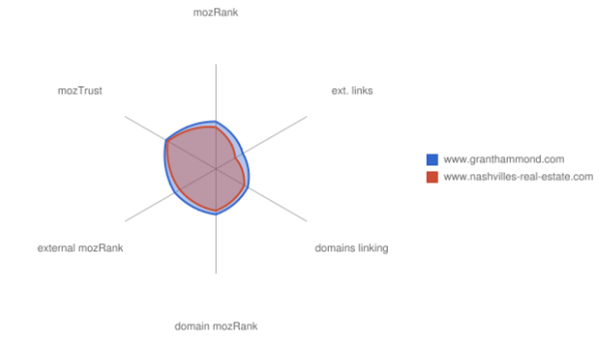 Not a new tool, but I like the radar graphs in SEOmoz Labs. These are great for demonstrating link analysis or providing a quick audit on a phone call or email. Let’s say the #12 ranked site nashvillebuyers.com called up and quickly wanted to know what it’d take to break into the Top 5. This quickly shows they're falling short on several significant ranking factors. This could also show that they’re beating other sites in all metrics. If this is the case, I might start looking at other factors like anchor text, anchor text distribution, link quality, and on-site targeting.