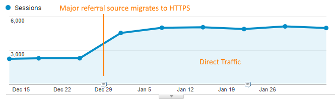 When a user follows a link on a secure (HTTPS) page to a non-secure (HTTP) page, no referrer data is passed, meaning the session appears as direct traffic instead of as a referral. Note that this is intended behavior. It’s part of how the secure protocol was designed, and it does not affect other scenarios: HTTP to HTTP, HTTPS to HTTPS, and even HTTP to HTTPS all pass referrer data.
