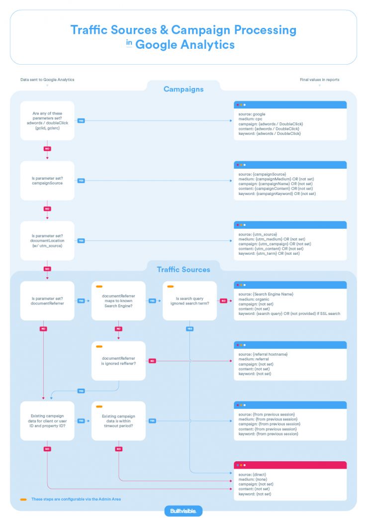To properly understand the causes and fixes for direct traffic, it’s important to understand exactly how GA processes traffic sources. The following flow-chart illustrates how sessions are bucketed — note that direct sits right at the end as a final "catch-all" group.