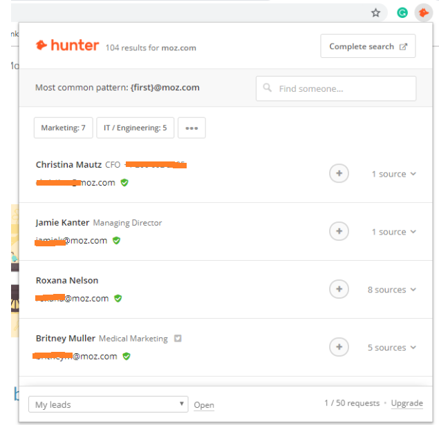 The major downside of working in bulk is coming up with an effective formula to sift through all the emails. Hunter may generate dozens of emails for one site, leaving you to essentially guess which email address is best for outreach. And if you’re relying on guess-work, chances are pretty high you’re leaving perfectly good prospects on the table.