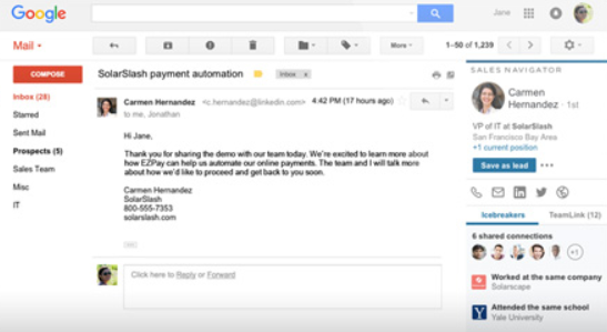Sales Navigator is such a tool. Sales Navigator is a Gmail extension that is easy to use. Simply enter the name of the person you’re looking for, and it will return all of the possible standard variations that they may use for their email address. Then, you can actually test the address from your Gmail account. When you type in the address into the proper line, a sidebar will appear on your screen. If there no is no information in that sidebar, you have the wrong address. If, however, you get a return that looks like this: