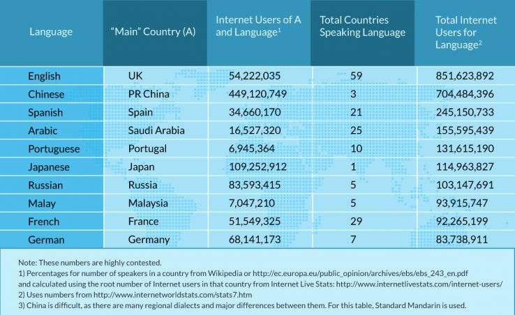 The first issue people run into is associating a country and a language. Many of the world’s top languages have root countries that share the same name; specifically, France/French, Germany/German, Portugal/Portuguese, Spain/Spanish, China/Chinese, Japan/Japanese, and Russia/Russian. Many of these languages are used in a number of other countries, however. Below is a list of the top languages used by Internet users.