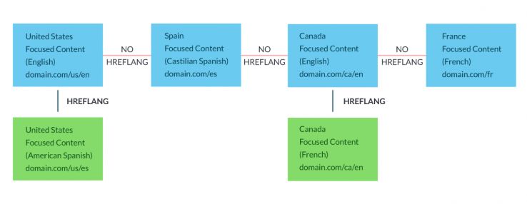 Example: A business starts off with a Canadian domain (domain.ca) and a France domain (domain.fr). They use hreflang between the English for Canada and French for France using the code below. They then add a US site and the code is modified to add a line for the US content.