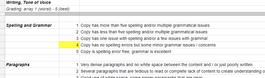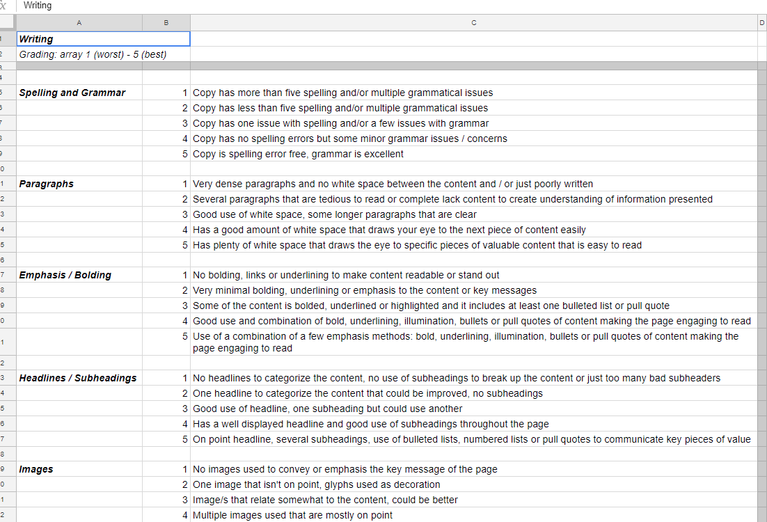 To use, start by choosing a part of your page to look at first. Order doesn’t matter, so whether you choose to first check “spelling and grammar” or “continuity” is up to you. Next, assign it a score on a separate Excel sheet (or mark it directly on the rubric) based on its current performance. For example, if the copy has no spelling errors but some minor grammar issues, you would rank “spelling and grammar” as a four (4).