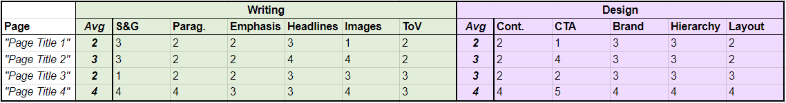 If working with multiple pieces of content at once, the grading system can also be used to help prioritize your workload. Just collect the average writing or design score and sort them in ascending/descending order. Pages with a lower average indicate poorer performance and should be prioritized over pages whose averages are higher.