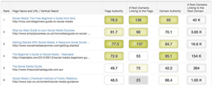 In the example above, it was simply a case of searching for "social media guide" and searching through the results. If you want to go a bit further, you can use the Moz keyword difficultly tool which gives you all sorts of metrics alongside each result too: