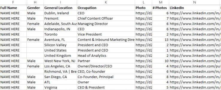 You can with uploading your information to FullContact, let's say this is a list of Twitter handles. These Twitter handles are your followers on Twitter which you've exported using a tool like Followerwonk. Once it's finished running, you'll have a list of these handles with related information if FullContact has been able to find it. Here is a snippet of one of my outputs to give you an idea what you'll get back: