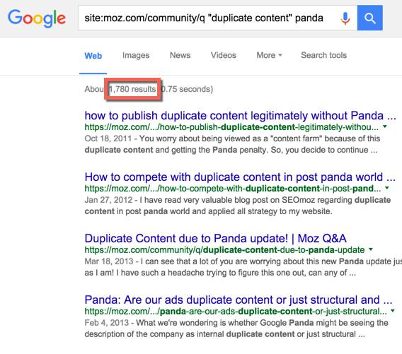But wait! Isn’t duplicate content a Panda issue? This is well believed in the SEO world. In fact, the Moz Q&A has almost 1800 pages indexed that ask about duplicate content and Panda!