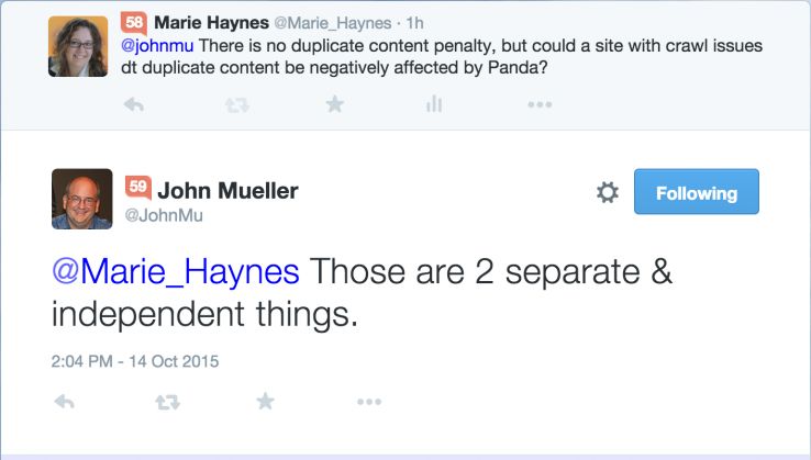 I asked John Mueller whether duplicate content issues could be Panda issues. I wondered if perhaps duplicate content reduced crawl efficiency and this, in turn, would be a signal of low quality in the eyes of the Panda algorithm. He responded saying that these were not related, but were in fact two separate issues: