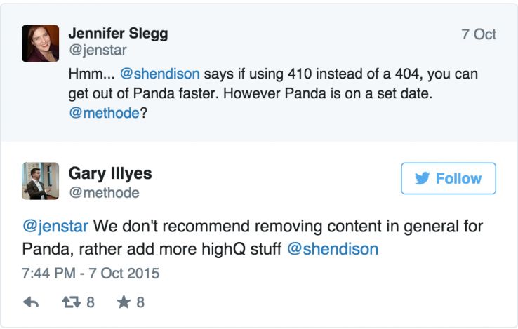 Jen Slegg from The SEM Post had a great writeup covering this discussion; if you’re interested in reading more, I wrote a long post discussing why I believe that we should indeed remove thin content when trying to recover from a Panda hit, along with a case study showing a site that made a nice Panda recovery after removing thin content.