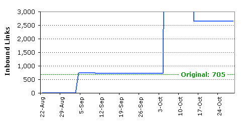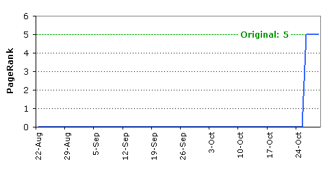 Finally, the one troublesome piece of data that held up this entire experiment: on October 27th, as part of Google's recent shuffle, the new domain finally registered a PageRank, jumping back to the original PR of 5. This was an overnight jump, and is consistent with Google's past practice of updating PRs on a roughly quarterly basis (ignoring the recent update drought).