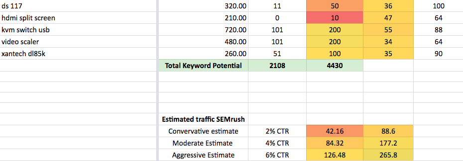 In the instance above, if we were to rank poorly, with a 2% CTR for 20 pages, we would drive an additional 42–89 targeted, commercial-intent visitors per month.