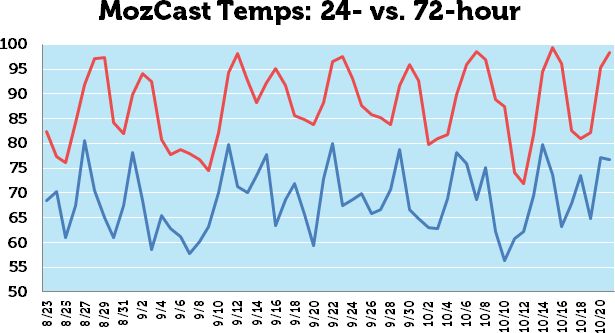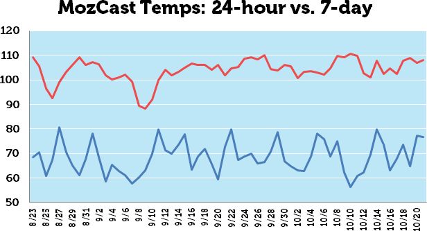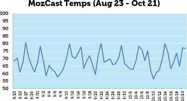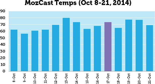 The purple bar is Friday, October 17th, the day Google originally said Penguin 3.0 rolled out. Keep in mind that MozCast is tuned to an average temperature of roughly 70°F. Friday’s temperature was slightly above average (73.6°), but nothing in the last few days indicates a change on the scale of the original Penguin update. For reference, Penguin 1.0 measured a scorching 93°F.
