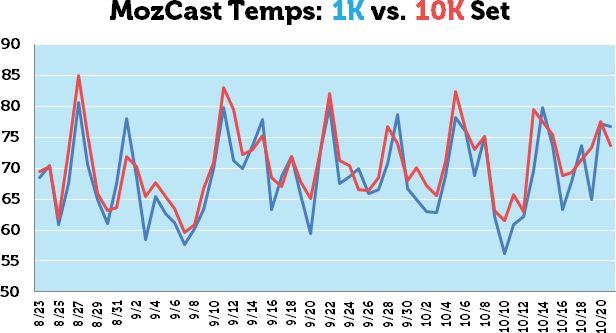Since then, MozCast has grown to what is essentially 11 weather stations of 1,000 different keywords each, split into two sets for analysis of 1K and 10K keywords. The 10K set is further split in half, with 5K keywords targeted to the US (delocalized) and 5K targeted to 5 cities. While the public temperature still usually comes from the 1K set, we use the 10K set to power the Feature Graph and as a consistency check and analysis tool. So, at any given time, we have multiple samples to compare.