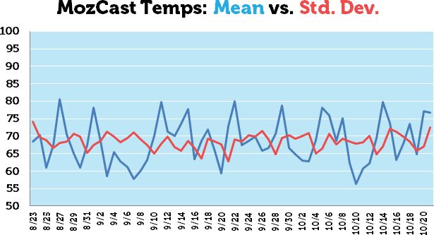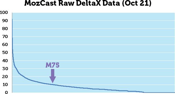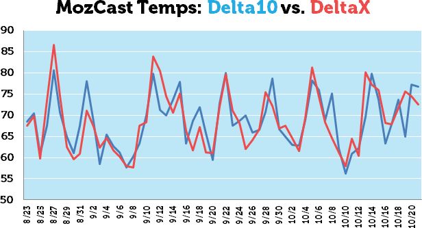 MozCast still operates on a relatively simple metric, which essentially looks at how much the top 10 rankings on any given day change compared to the previous day. This metric is position- and direction-agnostic, which is to say that a move from #1 to #3 is the same as a move from #9 to #7 (they’re both +2). Any keyword that drops off the rankings is a +10 (regardless of position), and any given keyword can score a change from 0-100. This metric, which I call “Delta100”, is roughly linearly transformed by taking the square root, resulting in a metric called “Delta10”. That value is then multiplied by a constant based on an average temperature of 70°. The transformations involve a little more math, but the core metric is pretty simplistic.