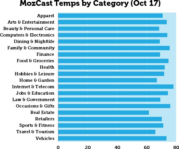In that every algorithm update only targets a select set of sites, pages, or queries, then yes – every update is a "niche" update. The only question we can pose to our data is whether Penguin 3.0 targeted a specific industry category/vertical. The 10K MozCast data set is split evenly into 20 industry categories. Here's the data from October 17th, the supposed data of the main rollout: