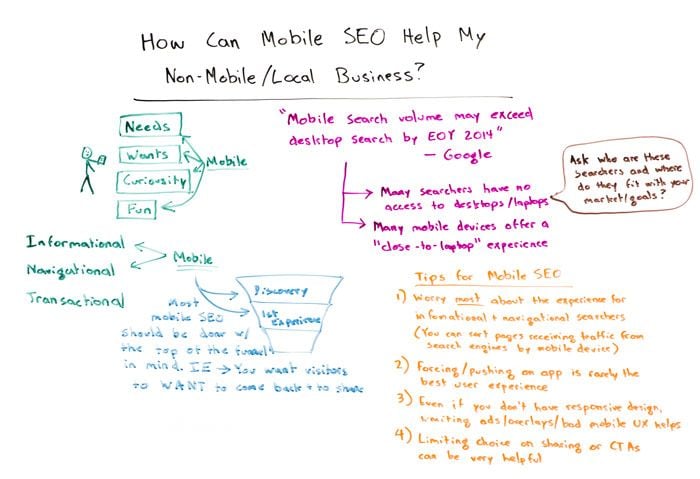Howdy, Moz fans, and welcome to another edition of Whiteboard Friday. This week I thought it was very interesting that Google came out and said mobile search volume may exceed desktop search volume by the end of 2014, by the end of year 2014. So next year, 2015, we might be living in a world where there are more searches on mobile devices than there are on desktops and laptops, which is fascinating. But I think it's very important to take a few steps back and realize what's going on here and then apply and say, "All right, how can mobile SEO, mobile search really help my business, even if I'm not a local-serving or a mobile-serving business?"