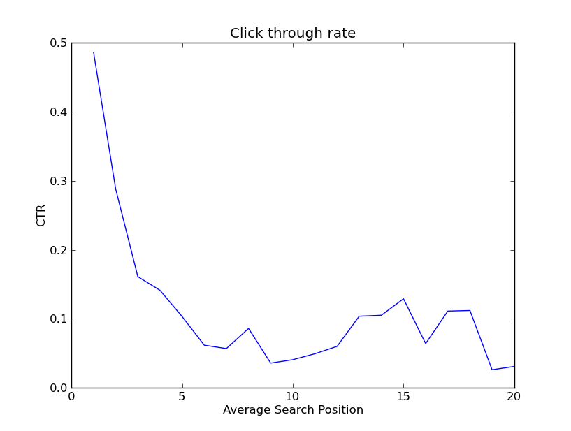 Indeed, the CTR drops off rapidly after the top five. There is an interesting bump up at position 15, but this is a data sparse region so this may not be a real signal.