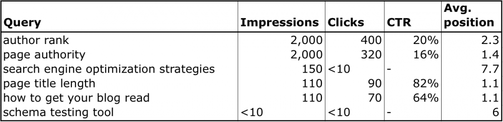 Throughout this post, we will use a data set from Google Webmaster Tools of keyword search referrals as a case study. Here's a snippet of the data: