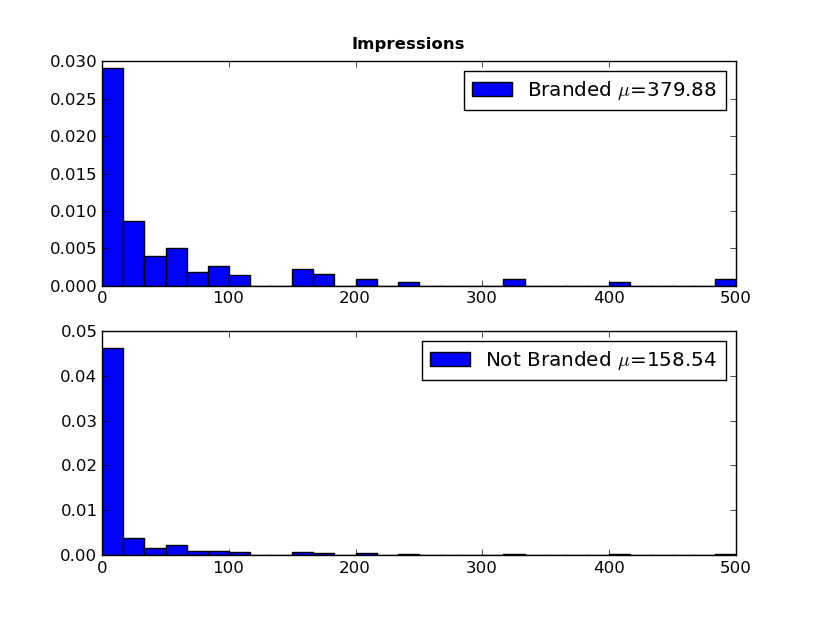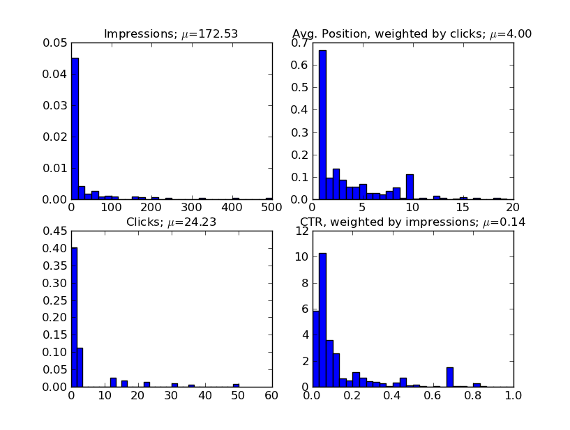 The above chart shows an example of univariate analysis on our data. In each panel, we have plotted the distribution of one of the four variables in our data: Impressions, Average Position, Clicks, and CTR. We also included the mean of each distribution in the title. Immediately, we can see a few interesting comparisons.